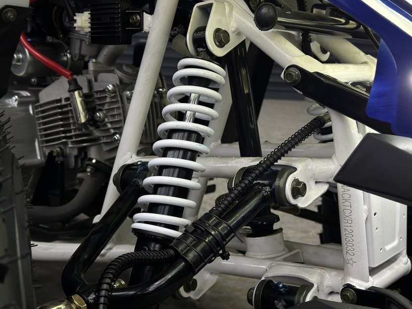 Шасси Sharmax 180 CROSS RX оснащено независимой передней подвеской с двойными А-образными рычагами и маятниковой задней подвеской с моноамортизатором, обеспечивающими комфортное управление и отличную устойчивость. Ход передней подвески составляет 120 мм, а задней – 180 мм. Квадроцикл оборудован газомаслянными передними амортизаторами и моноамортизатором на задней оси. С максимальной скоростью 65 км/ч, он идеально подходит для активного отдыха.