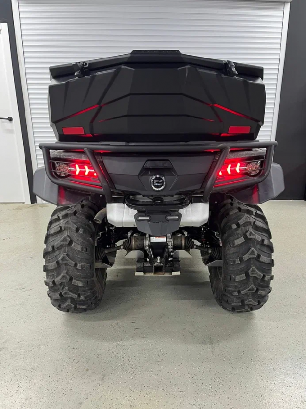Конечно усилитель рулевого управления (EPS) остался не тронутым, а вот стандартная комплектация это просто нечто! Эксклюзивная солидная расцветка кузова - серый матвый графит, великоленыеые легкосплавные 14 дюймовые диски с бедлоками, два, мы не ошиблись, ДВА задних кофра, один из которых можно поставить вместо заднего сиденья, передний и задний силовые бамперы особой серии, ветровое стекло в сочетании с совершенной дизайнерской защитой рук, 8-ми милиметровая пластиковая защита днища с алюминиевой защитой лебедки и расширители арок особопривлекательного рубленого дизайна, все это сделало CFORCE 1000 OVERLAND неповторимым и совершенно особенным на российском рынке квадроциклов.