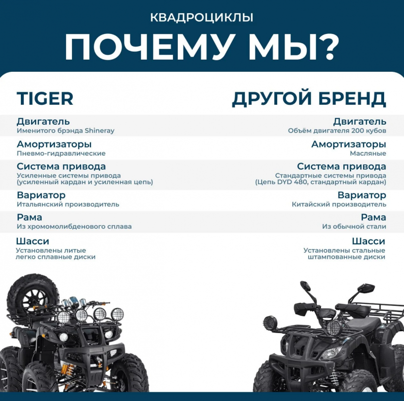 Стартовав в 2019 году, молодой и дерзкий бренд Tiger стремительно занял лидирующие позиции в мотоиндустрии. Главное правило компании — никаких авторитетов, только прогресс. Утилитарный квадроцикл Tiger MAX GRADE – одно из лучших предложений в классе ATV до 500 куб.см. Наконец-то на российском рынке предлагается модель с уникальной механической трансмиссией и независимой передней подвеской на двойных поперечных рычагах.