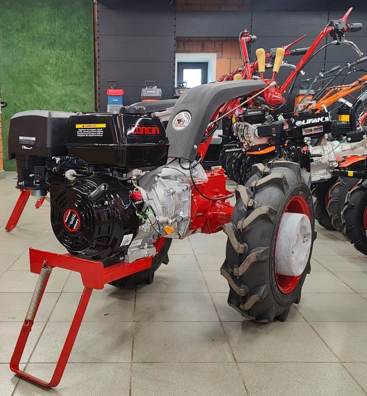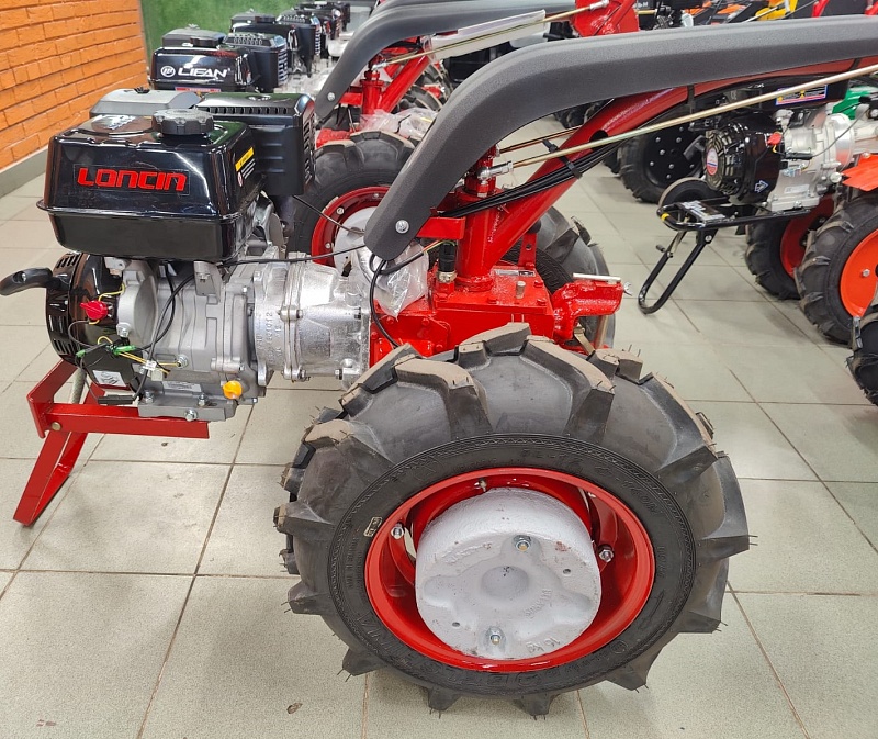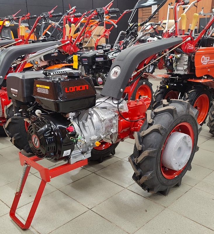 Мотоблок Беларус 012WM с двигателем LONCIN G390F 13 л.с. профессиональный мотоблок тяжелого класса для работ в небольших фермерских хозяйствах и коммунальных службах. Существенный вес мотоблока (176 кг.), позволяет ему уверенно обрабатывать целинные почвы и тянуть активную навеску по уборке снега или кошению травы. Мотоблок оборудован шестеренчатым валом отбора мощности (ВОМ), позволяющим отнимать часть мощности двигателя для питания активной навески. На мотоблоке установлена коробка передач, 4 скорости вперед и 2 назад, а так же с возможностью переключения режимов на пониженый повышеный. Благодаря такой коробке передач, мотоблок может разгонять транспортировочную телегу грузоподъемностью до 750 кг. до скорости в 16 км/ч.