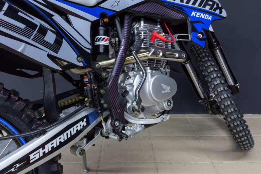 Подвеску Sharmax Power Max 250 можно настроить под грязь, камни и песок без потери качества. Передняя вилка фирмы KKE имеет регулировки сжатия и отбоя, задняя (KKE) — справится с любыми преградами, от камней до деревьев. Байк легко настроить под свой вес, подобрав идеальный баланс жёсткости.