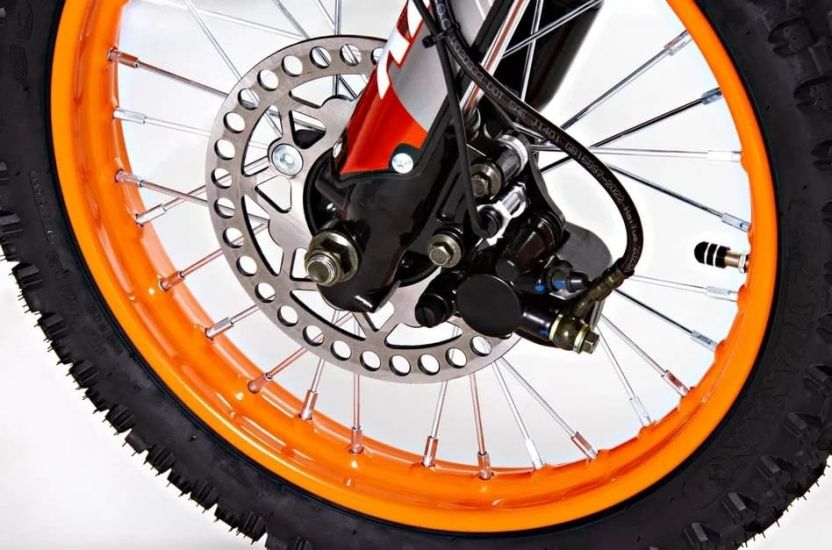 Вилка перевёрнутого типа (диаметр стакана составляет 45-48 мм, диаметр штока амортизатора — 33 мм) длиной 710 мм имеет жёсткую конструкцию и отличается эффективной управляемостью. Такой питбайк отличается более продуктивной обратной связью, чем мотоцикл с телескопической вилкой.