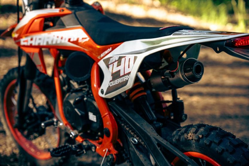 Задняя подвеска выполнена с регулировкой преднатяга пружины, которая позволяет питбайку стабильно проходить сложные участки трассы, не виляя на поворотах. Стальной маятник изготовлен из надёжного хромомолибденового сплава.